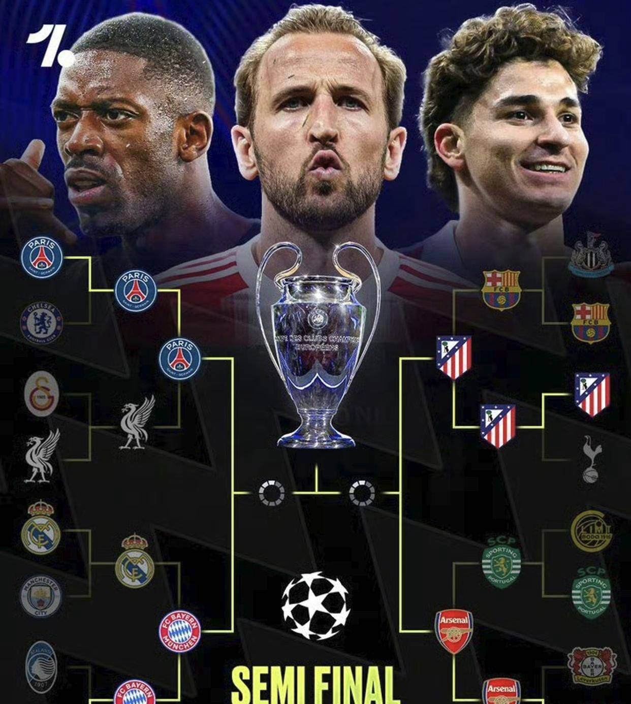 欧冠四强揭晓:拜仁对阵巴黎,阿森纳迎战马竞,决赛对决大概率在这两队之间